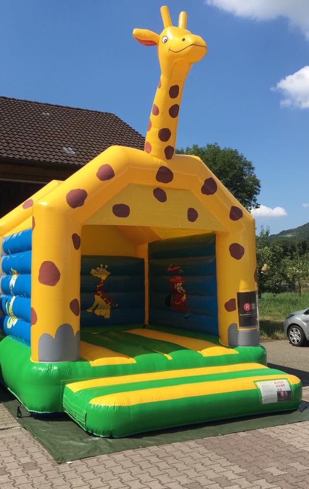 Ein Hüpfburg im Giraffe-Stil mit Dach. Diese Hüpfburg Standard Giraffe mit Dach eignet sich besonders für die kleine Gäste Ihrer Veranstaltung. Das Dach bietet die Kinder Schutz vor Regen und Sonnen Strahlung.